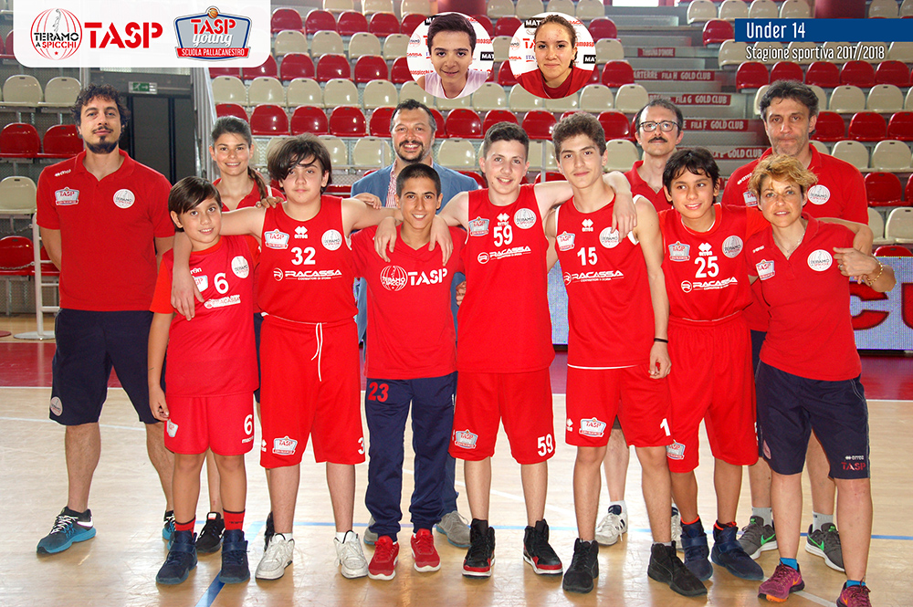Teramo a Spicchi U14: in seconda fila da sinistra Federico Forlani (assistant coach), Nastasia Di Carlo (coach), Fabio Nardi (presidente), Paolo Marini (dirigente), Luigi De Laurentiis (dirigente); in prima fila da sinistra Alessandro Caputo, Davide Di Giacomo, Matteo Di Benedetto, Filippo Di Giacomo, Jacopo Damiani, Anthony Caputo, Laura Biancacci (preparatore atletico); nei riquadri Andrea Sforza e Denise Fiorà.